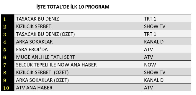 Zaman atlamasıyla yayınlanan Kızılcık Şerbeti ise önceki haftaya göre izlenme oranlarını artırdı. AB kategorisinde Taşacak Bu Deniz’in özetinin gerisinde kalan Kızılcık Şerbeti, TOTAL ve ABC1 kategorilerinde ikinci sıraya yükseldi.