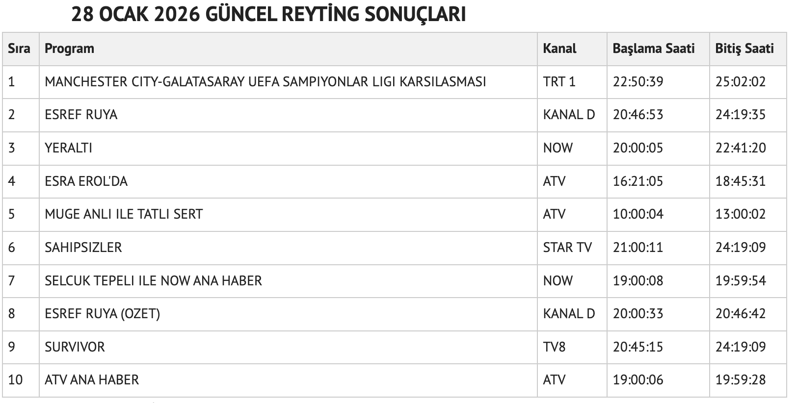 Televizyon izleyicisinin tercihlerini yansıtan reytingler, her yeni gün farklı sürprizler sunmaya devam ediyor. İzleyici davranışları ve popüler yapımlar, ekran rekabetini şekillendirmeye devam ediyor.