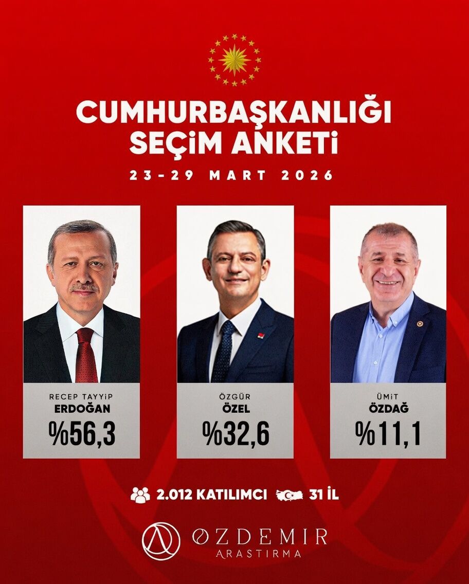 Özdemir Araştırma’nın çalışmasında, katılımcılara Recep Tayyip Erdoğan, Özgür Özel ve Ümit Özdağ’ın yer aldığı bir seçimde tercihleri soruldu.