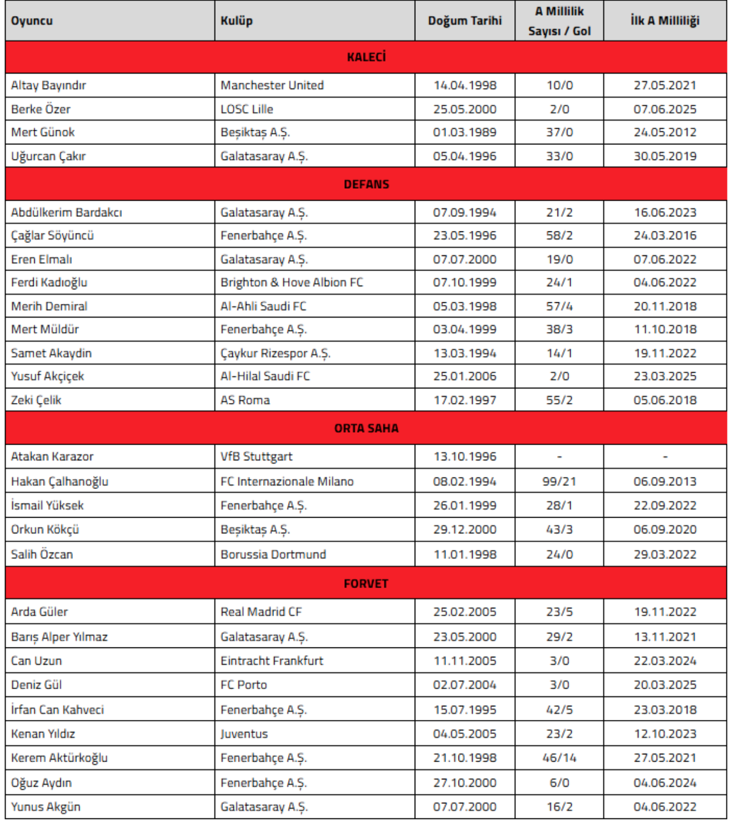 2026 FIFA Dünya Kupası Elemeleri'nde mücadele edecek A Milli Takımımızın aday kadrosu belli oldu.