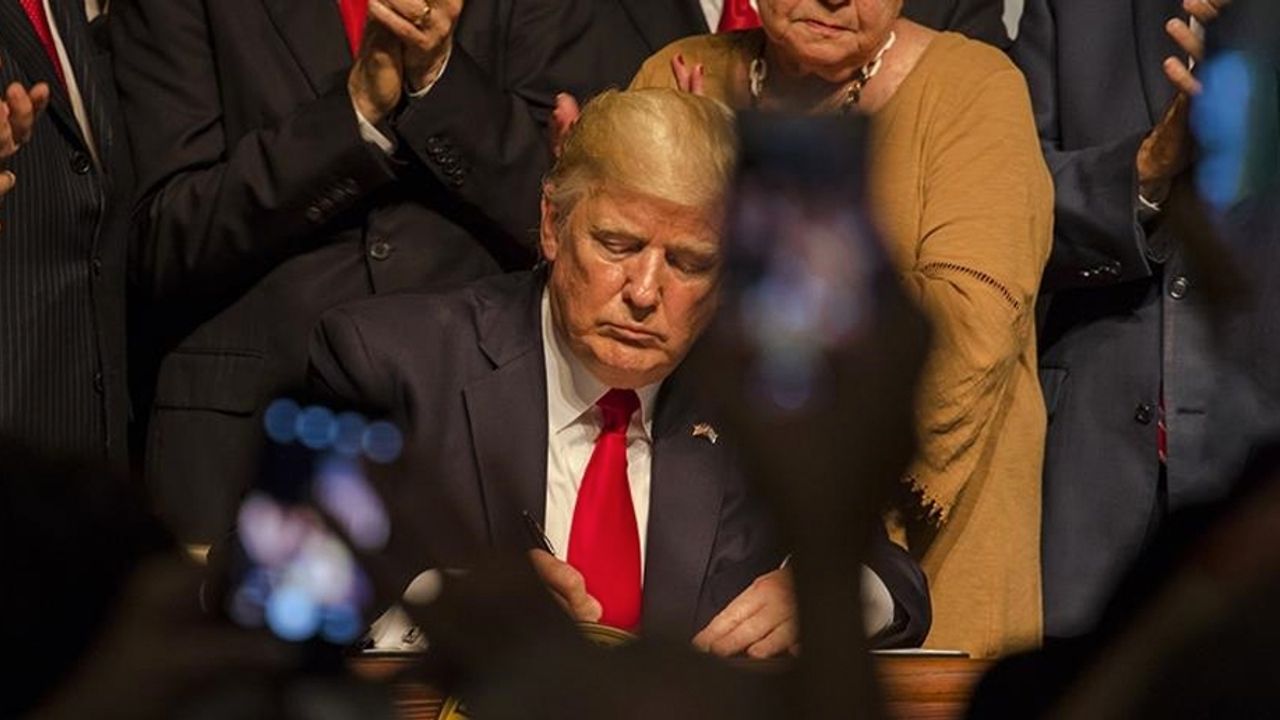 Daha sonra eşi Melania Trump ile aynı masaya oturan ABD Başkanı Trump, söz konusu başkanlık kararnamesine imza attı.