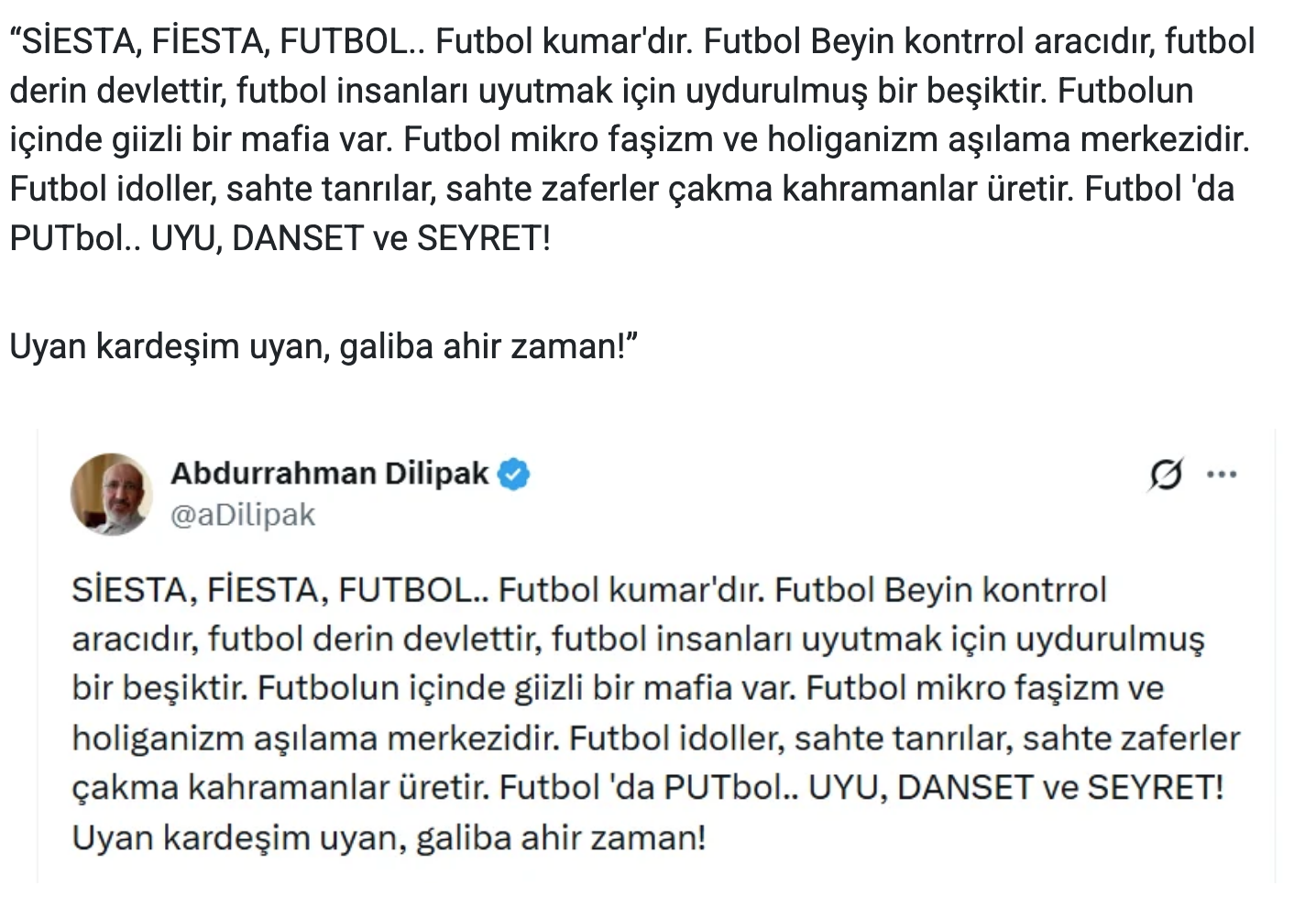 Türkiye’de futbolda yasadışı bahis soruşturması gündemde. Son operasyonlarda, eski Galatasaray Sportif AŞ Başkan Vekili Erden Timur, Eyüpspor As Başkanı Fatih Kulaksız ve TFF yöneticisi Buğra Cem İmamoğulları dahil 29 kişi, 11 ilde eş zamanlı operasyonla gözaltına alındı; Erden Timur’un tutuklanması dikkat çekti. İslamcı yazar Abdurrahman Dilipak ise “Futbolun içinde gizli bir mafia var” mesajıyla dikkat çekti.
