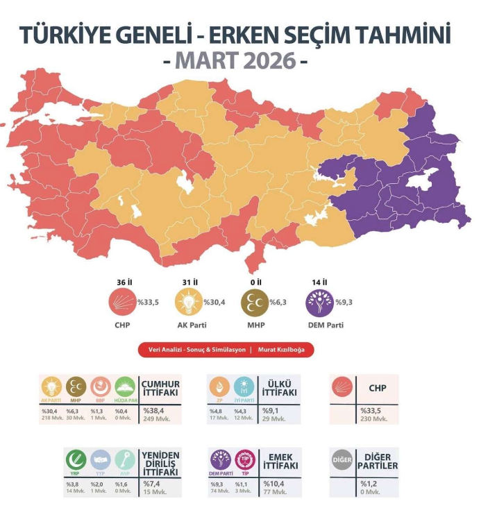 Murat Kızılboğa, erken seçimde partilerin oy oranlarına dair detaylı bir analiz paylaştı. Kızılboğa’nın çalışması, siyasi tabloyu ve olası sonuçları değerlendirmek açısından dikkat çekiyor.