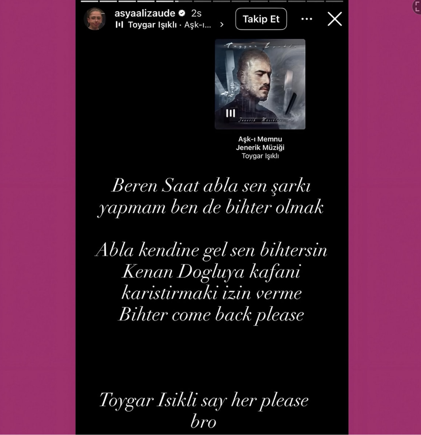 Rap şarkılarıyla tanınan Alizade de Beren Saat’in yeni çalışması için sosyal medyada dikkat çeken bir paylaşım yaptı. Alizade, “Beren Saat abla sen şarkı yapmam ben de Bihter olmak. Abla kendine gel sen Bihtersin. Kenan Doğulu’ya kafanı karıştırmasına izin verme. Bihter come back please. Toygar Işıklı say her please bro” ifadelerini kullandı.