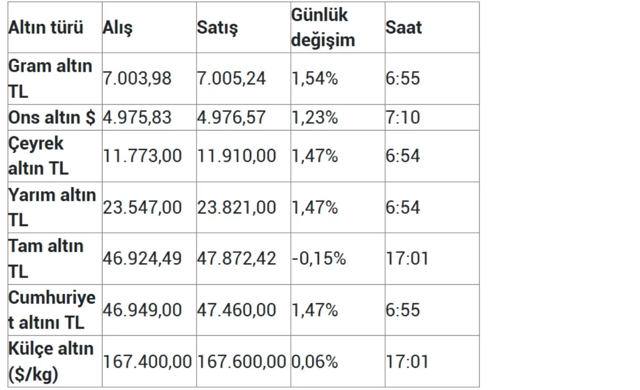 Gram altın, dün akşam saatlerinde yaşanan sert düşüşle 6 bin 871,12 TL seviyesine kadar geriledi. Hafta boyunca dar bantta küçük yükselişlerle 7 bin 172 TL’ye kadar çıkan altın, sabah saatleri itibarıyla 6 bin 990 – 7 bin TL bandında işlem görmeye başladı.