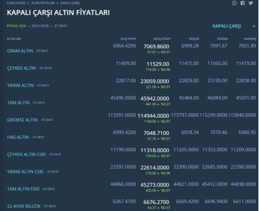 Onstaki hareketlilik gram altın fiyatını da yeni rekorlara taşıyor. 23 Ocak 2026 gram altın fiyatı spot piyasada 6.919 TL ile yeni rekor seviyesine ulaştı.