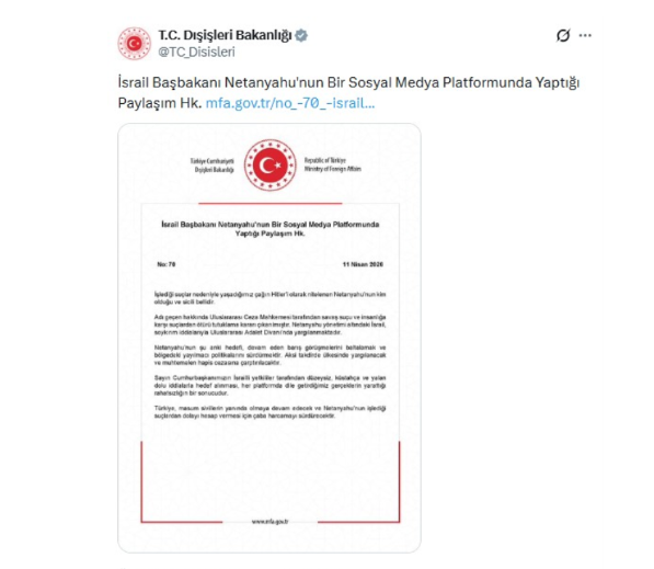 Bakanlık açıklamasında, Netanyahu’nun işlediği suçlar nedeniyle “çağın Hitler’i” olarak nitelendirildiği belirtilerek, İsrailli liderin kimliğinin ve geçmişinin açık olduğu vurgulandı. Ayrıca Uluslararası Ceza Mahkemesi tarafından savaş suçu ve insanlığa karşı suç iddiaları kapsamında tutuklama kararı bulunduğu hatırlatıldı.