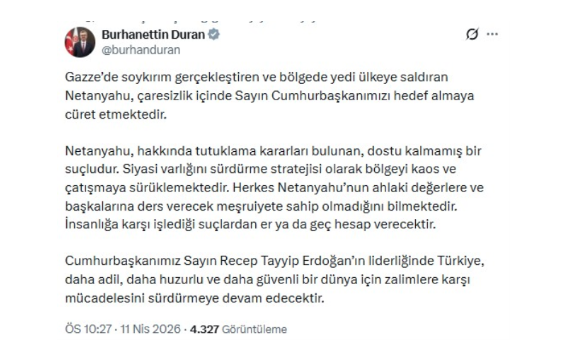 Burhanettin Duran, Benjamin Netanyahu’nun açıklamalarına ilişkin sert bir değerlendirmede bulundu.