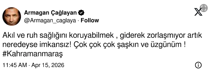 Çağlayan, X hesabından yaptığı paylaşımda 'Akıl ve ruh sağlığını koruyabilmek giderek zorlaşmıyor artık neredeyse imkansız! Çok çok çok şaşkın ve üzgünüm' ifadelerini kullandı.