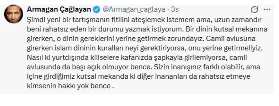 Paylaşımına temkinli bir ifadeyle başlayan Çağlayan, uzun süredir kendisini rahatsız eden bir konuyu dile getirmek istediğini belirtti. Açıklamasında, tartışma yaratma niyetinde olmadığını özellikle vurgulayan Çağlayan herhangi bir kutsal mekana girilirken o dinin gereklerinin yerine getirilmesi gerektiğini vurguladı. Bu durumun kişisel inançlardan bağımsız olduğunu belirten Çağlayan, kutsal mekânların ortak bir saygı alanı olduğunu ifade etti.
