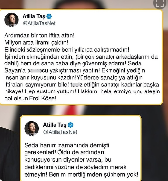 Bu isimlerden biri olan Atilla Taş, sosyal medya hesabından yaptığı paylaşımda Köse’ye yönelik sert ifadeler kullandı. Taş, “Ardımdan bir ton iftira attın! Milyonlarca liramı çaldın!” sözleriyle dikkat çekti.
