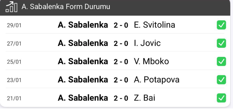 Aryna Sabalenka çeyrek finalde Iva Jovic'i, yarı finalde ise Elina Svitolina'yı 2-0'la geçerek rahat bir oyunla finale yükselmişti.