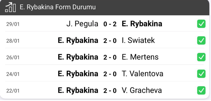 Elena Rybakina ise çeyrek finalde 6 kez Grand Slam şampiyonu Iga Swiatek'i 2-0'la geçmiş; yarı finalde de Jessica Pegula'yı aynı skorla mağlup etmişti.