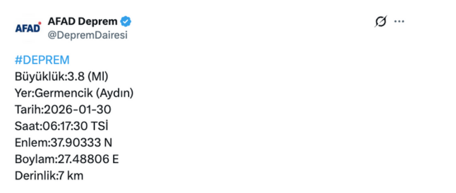 Afet ve Acil Durum Yönetimi Başkanlığı (AFAD) Deprem Dairesi, Aydın'ın Germencik ilçesinde saat 06.17 sıralarında 3.8 büyüklüğünde bir deprem meydana geldiğini duyurdu.