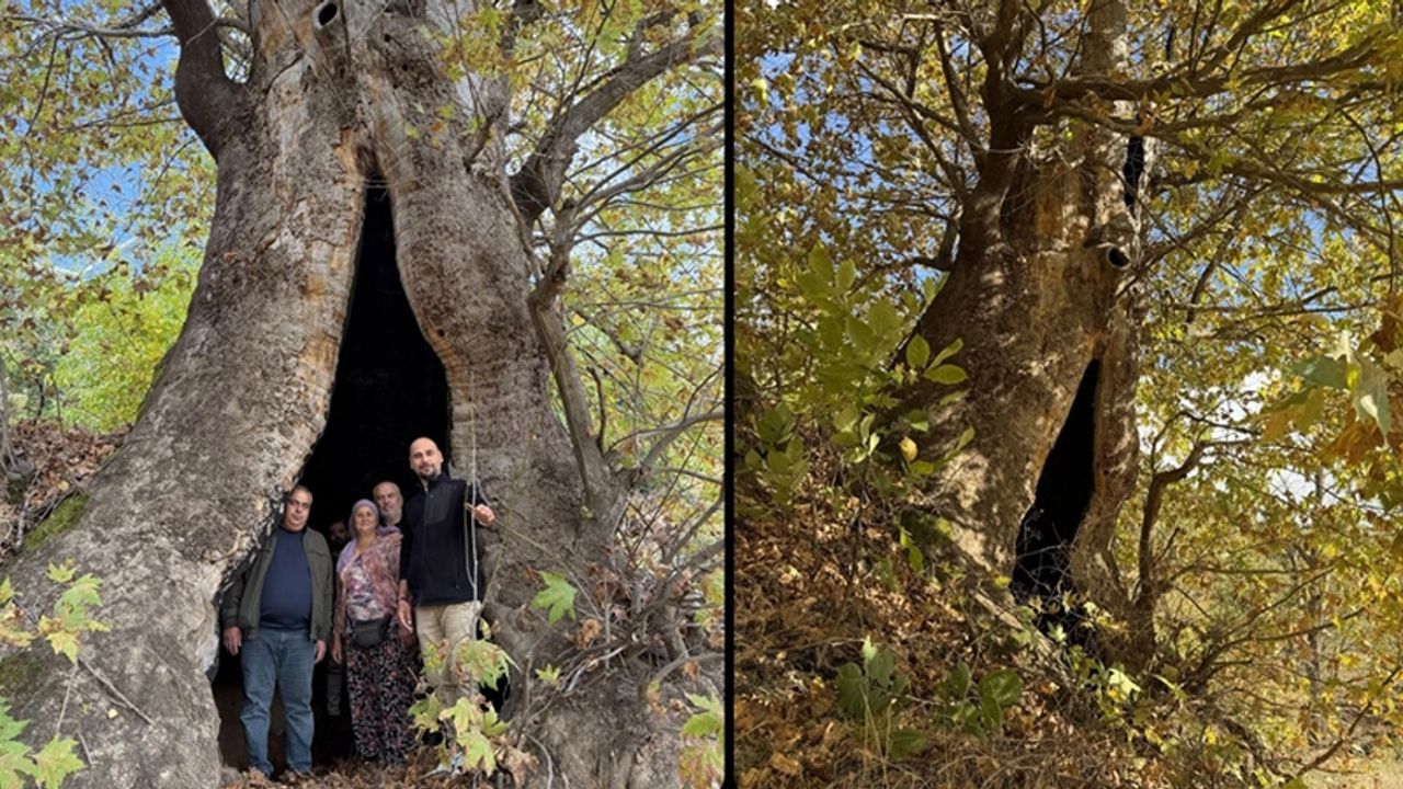 Karahallı Mahallesi'nin Böğürtlenlik mevkisinde tarihe tanıklık eden çınar ağacı, 12 metre gövde kalınlığı, 9 metre iç genişliğiyle dikkati çekiyor.