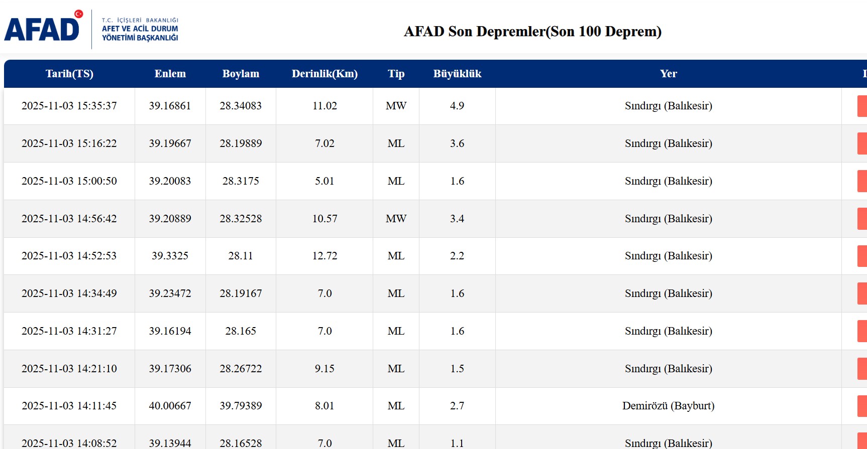 Geçtiğimiz 27 Ekim'de meydana gelmiş olan 6.1 büyüklüğündeki deprem sonrası Balıkesir Sındırgı'da artçı sarsıntılar sürüyor. Son olarak AFAD tarafından kaydedilen güncel verilere göre merkez üssü Balıkesir Sındırgı olan 4.9 büyüklüğünde deprem gerçekleşti.