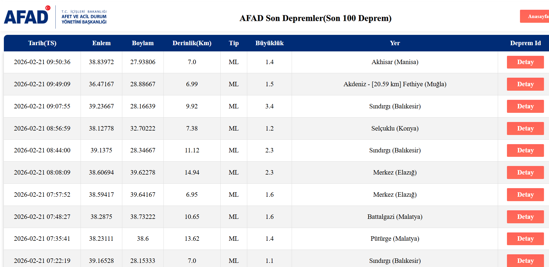Afet ve Acil Durum Yönetim Başkanlığı (AFAD) son depremler listesine göre bütün depremler son depremler listesinde görüntüleniyor.