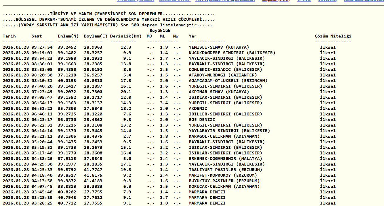 AFAD VE KANDİLLİ SON DEPREMLER LİSTESİ
