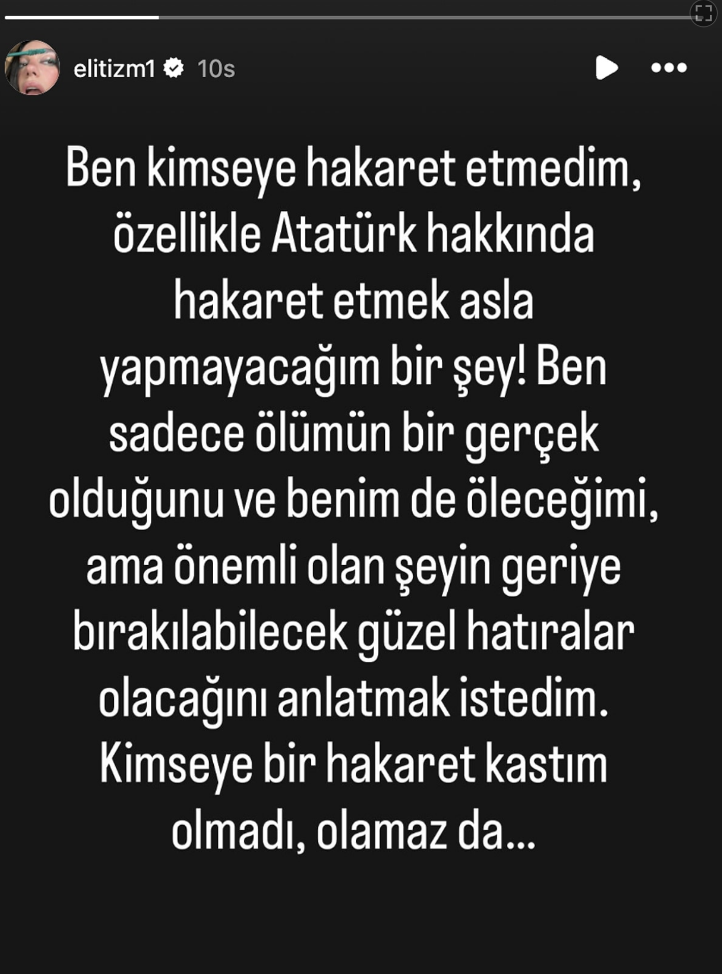 “Ben kimseye hakaret etmedim, özellikle Atatürk’e hakaret etmek asla yapmayacağım bir şey. Ölümün bir gerçek olduğunu ve geriye sadece güzel hatıraların kalacağını anlatmak istedim” ifadelerini kullandı.