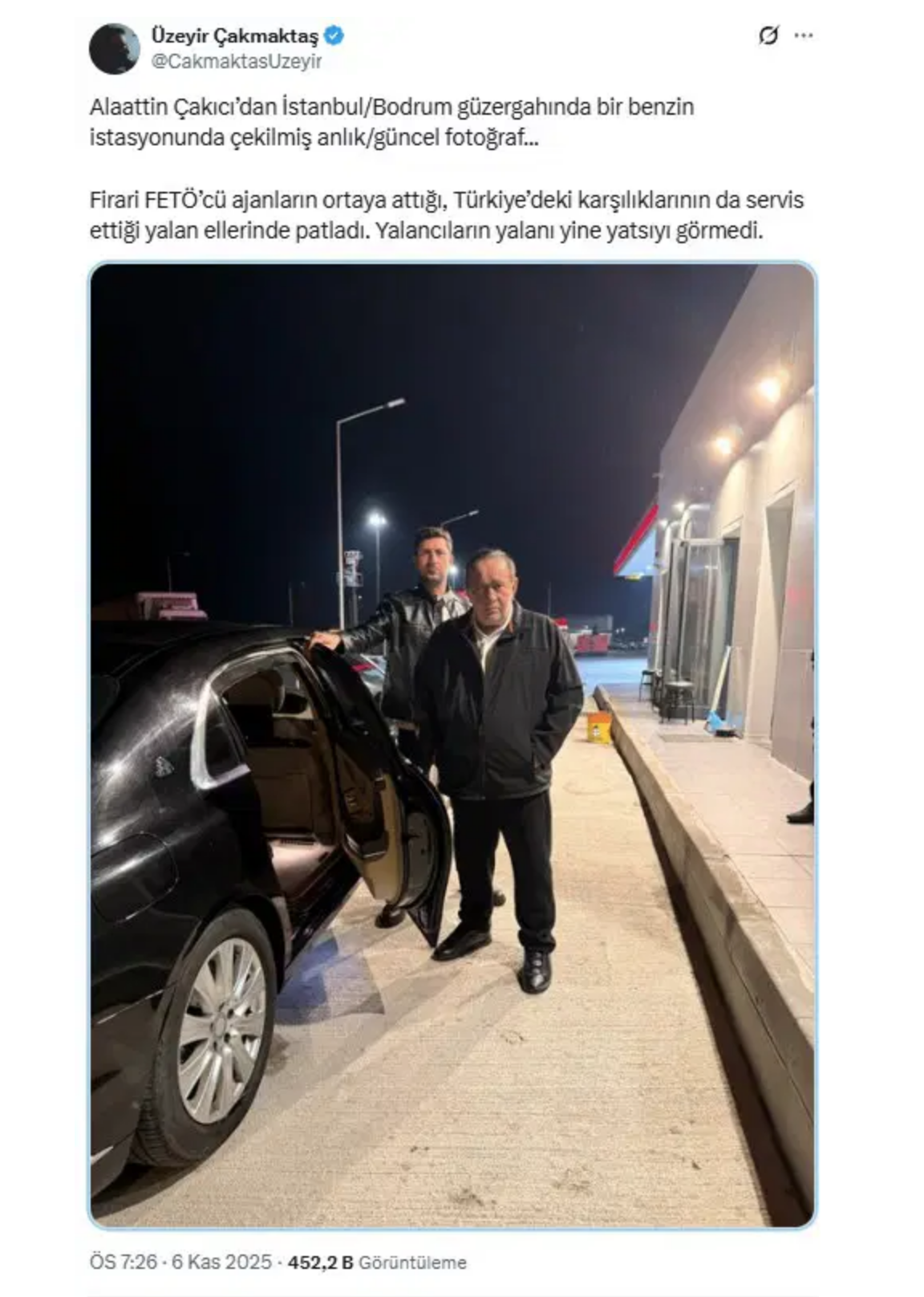 "Alaattin Çakıcı’dan İstanbul/Bodrum güzergahında bir benzin istasyonunda çekilmiş anlık/güncel fotoğraf... Firari FETÖ’cü ajanların ortaya attığı, Türkiye’deki karşılıklarının da servis ettiği yalan ellerinde patladı. Yalancıların yalanı yine yatsıyı görmedi."