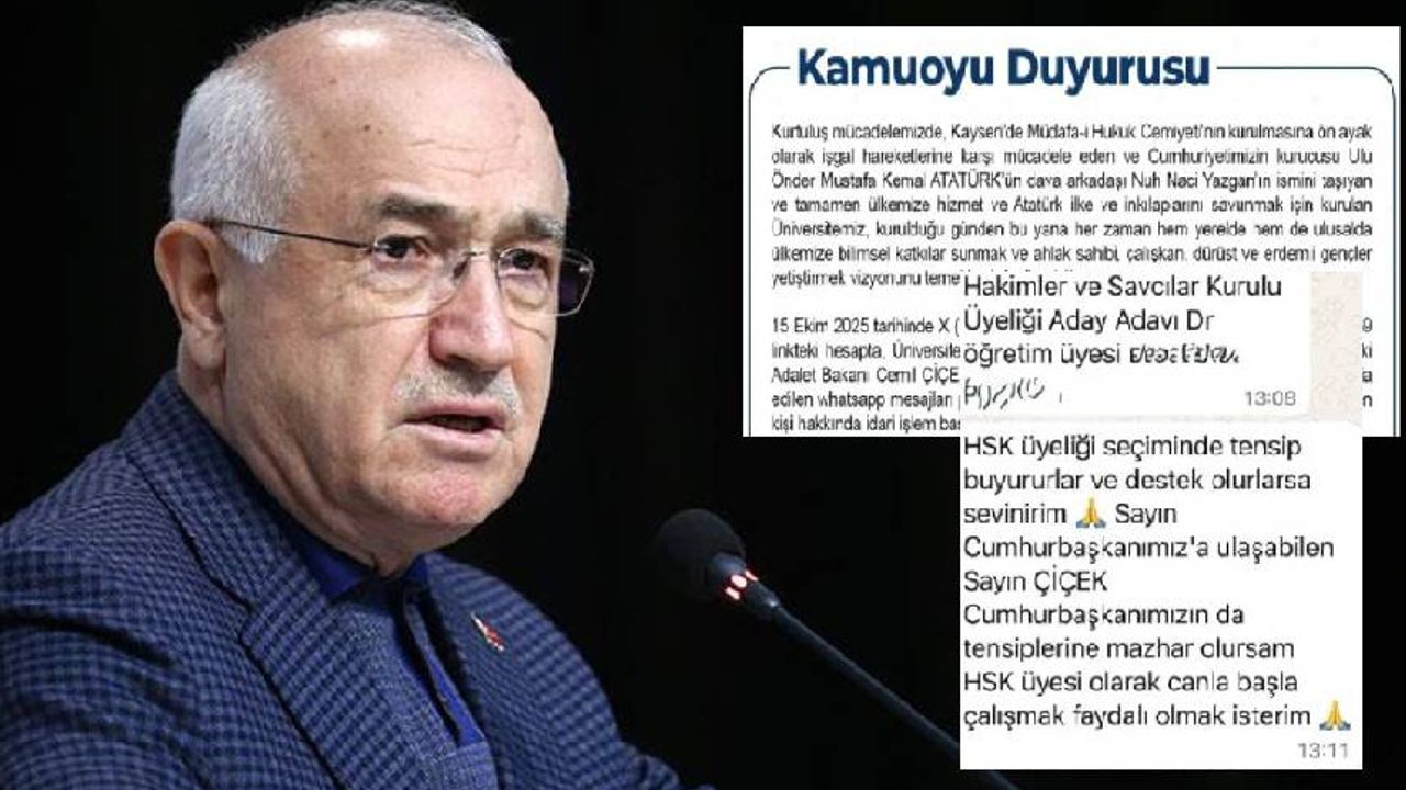 Kayseri Nuh Hacı Yazgan Üniversitesi'nde görev yapan bir akademisyen, eski Adalet Bakanı Cemil Çiçek'e göndermek istediği mesajı yanlışlıkla aynı ismi taşıyan avukatın telefonuna gönderince skandal ifşa oldu. Akademisyen, WhatsaApp mesajında, eski Bakan Çiçek'ten HSK üyeliği için kendisine torpil yapılmasını istedi.