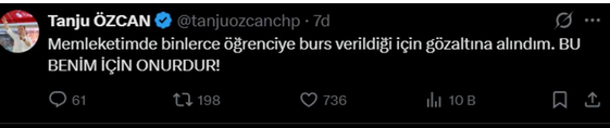 Sosyal medya hesabından bir açıklama daha yapan Özcan "Memleketimde binlerce öğrenciye burs verildiği için gözaltına alındım. Bu benim için bir onurdur!" ifadelerine yer verdi.