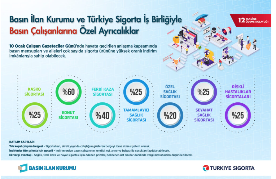 İş birliği kapsamında Basın İlan Kurumu’na akredite gazete, dergi ve internet haber sitelerinde istihdam edilenler ve birinci derece yakınları, Türkiye Sigorta A.Ş. tarafından sunulan sigorta ürünlerinden indirimli olarak yararlanabilecek. Basına yönelik destekler; kasko, konut, ferdi kaza, sağlık ve seyahat sigortaları başta olmak üzere geniş bir yelpazeyi kapsıyor.