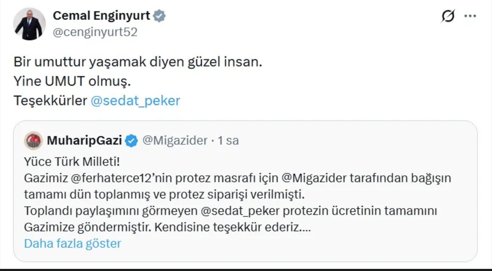 Bu gelişmenin ardından CHP Milletvekili Cemal Enginyurt, Peker’e teşekkürlerini iletti. Enginyurt, Peker’in desteğinin gazi Erce için büyük bir kolaylık sağladığını ve toplumda dayanışma örneği teşkil ettiğini ifade etti.