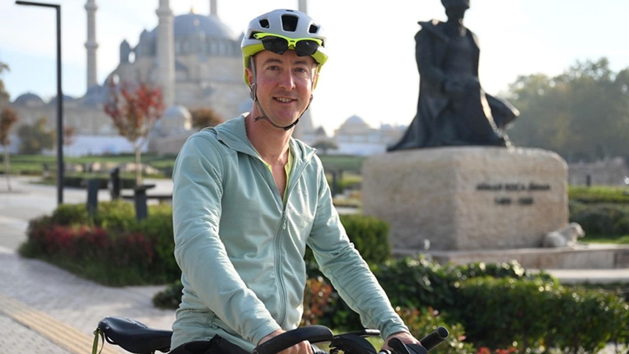 Makine mühendisi 38 yaşındaki Nick Cresswell, Selimiye Meydanı'nda gazetecilere, Edinburgh kentinden 14 Haziran'da başlattığı yolculukta Kapıkule Sınır Kapısı'ndan Türkiye'ye giriş yaptığını söyledi.