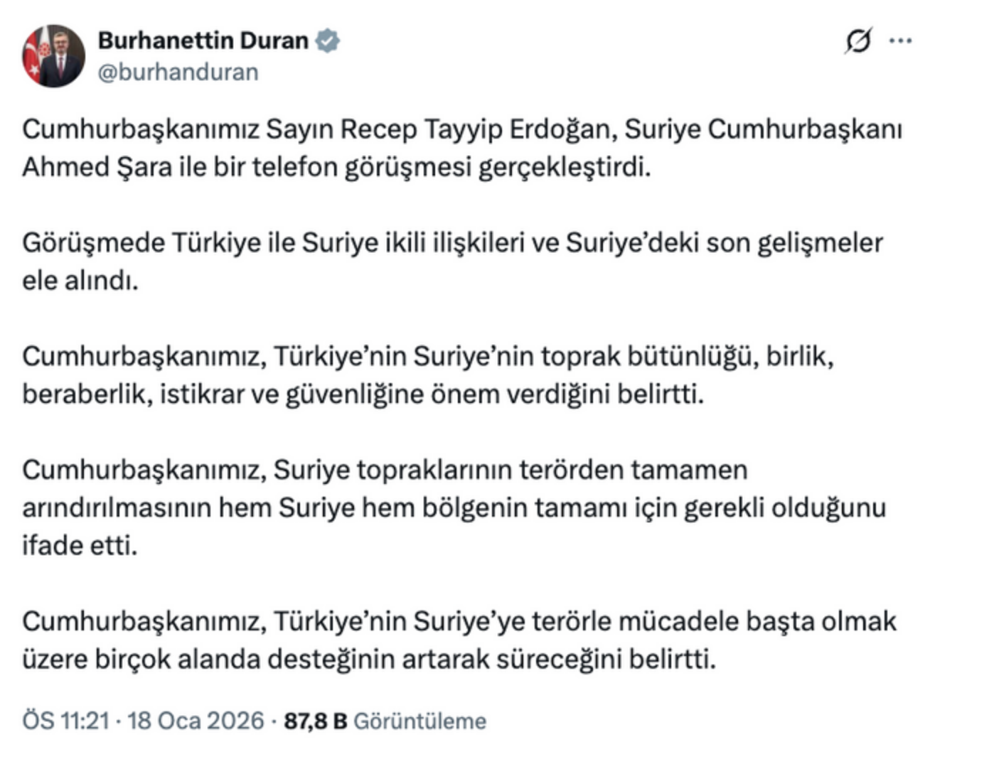 Cumhurbaşkanlığı İletişim Başkanı Burhanettin Duran, Cumhurbaşkanı Recep Tayyip Erdoğan’ın Suriye Cumhurbaşkanı Ahmed Şara ile telefon görüşmesi gerçekleştirdiğini duyurdu. Duran, sosyal medya hesabından yaptığı açıklamada, görüşmede Türkiye ile Suriye arasındaki ikili ilişkiler ile Suriye’deki son gelişmelerin ele alındığını bildirdi.