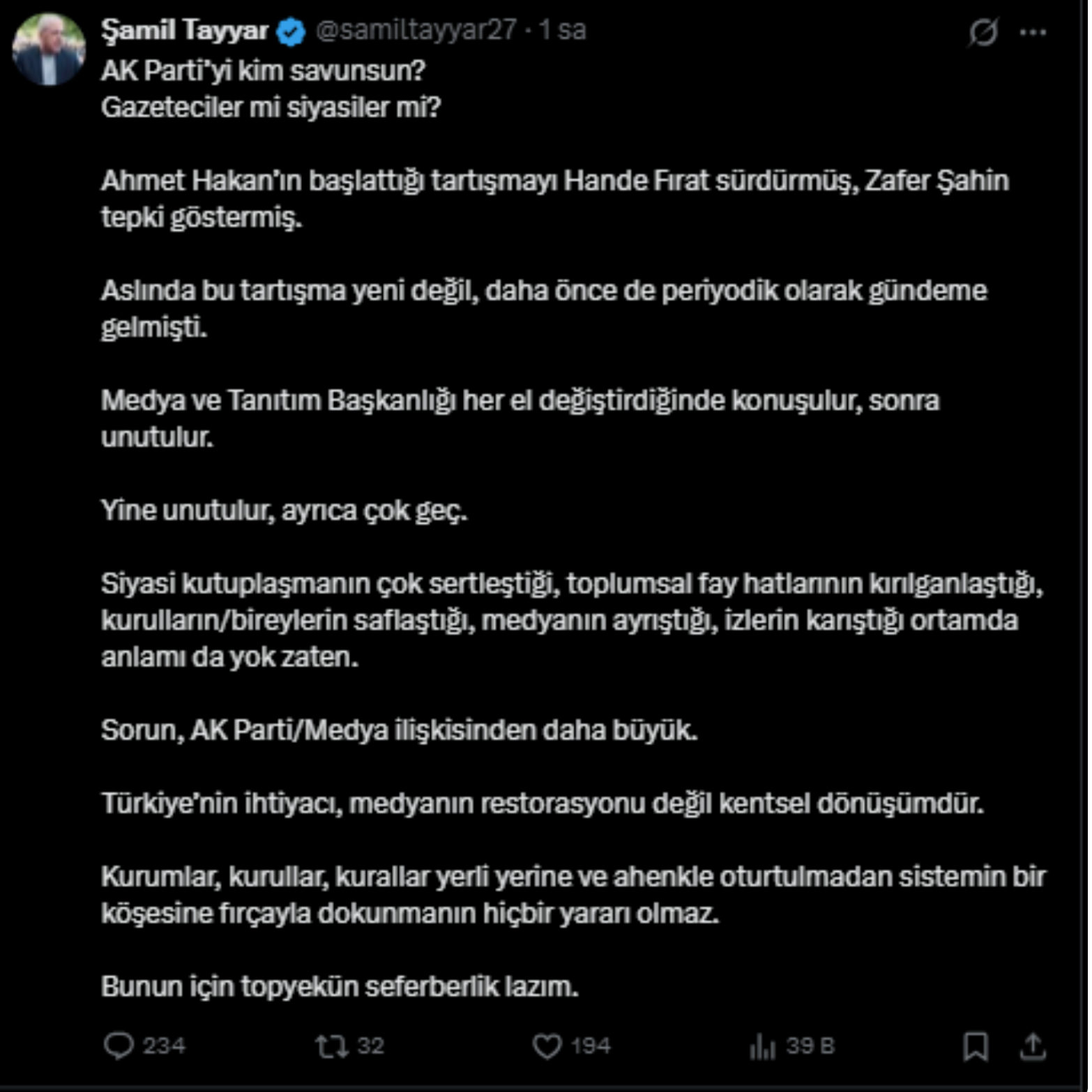 AK Part'li Şamil Tayyar da konuyu Ahmet Hakan üzerinden görmeyi tercih etti ve sosyal medya hesabından 'AKP'li vekil' tartışmasına dahil oldu.