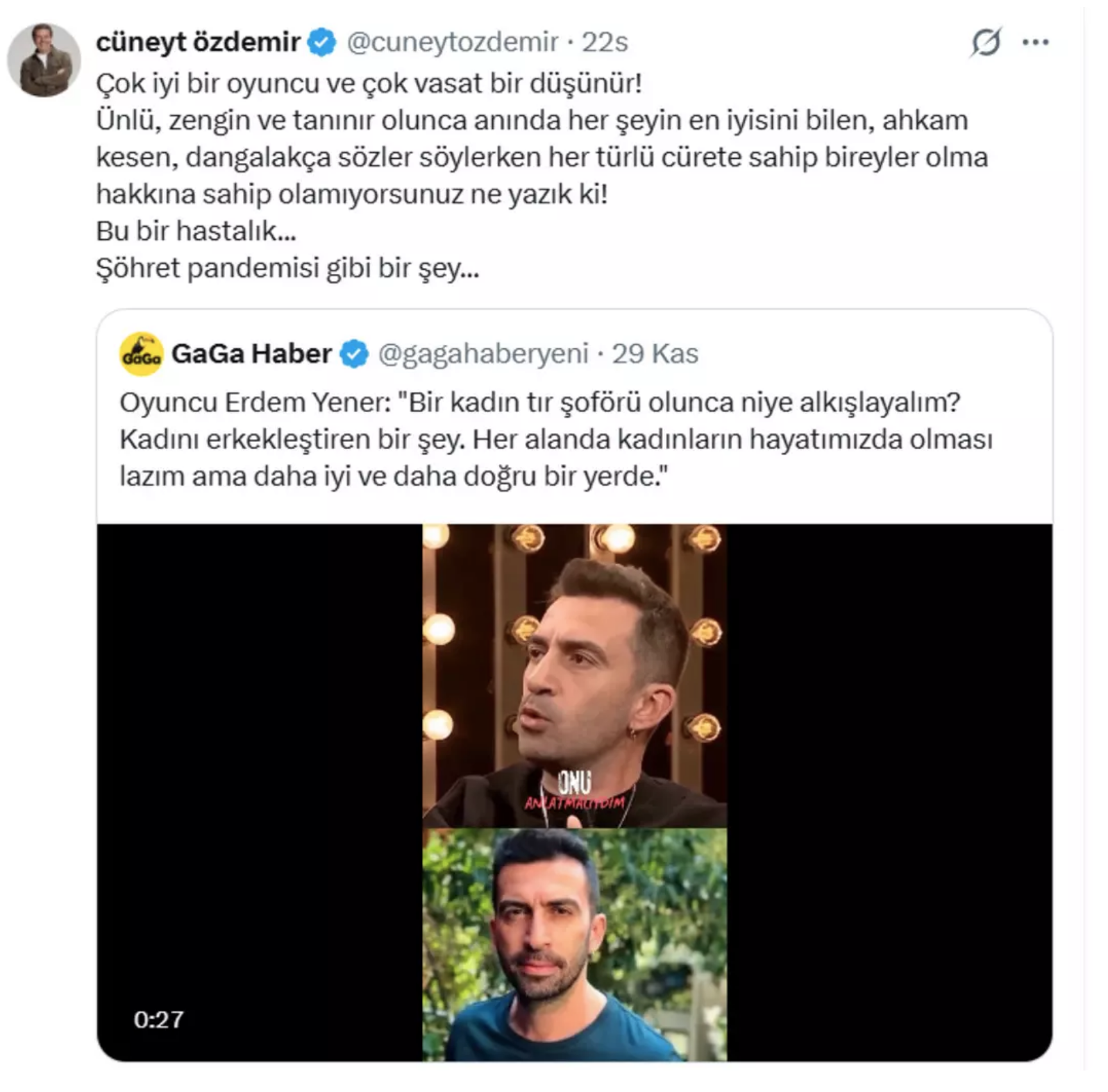 Erdem Yener'in katıldığı bir programda söylediği sözler gündeme geldi. Oyuncu kadınlar hakkındaki ifadelerinde "Bir kadın tır şoförü olunca 'helal olsun' alkış. Herhangi bir erkeğin yapabileceğini neden bir kadın yapsın ki? Kadın beyninin stratejik olarak kapasitesi daha geniş" diyerek şunları söyledi: