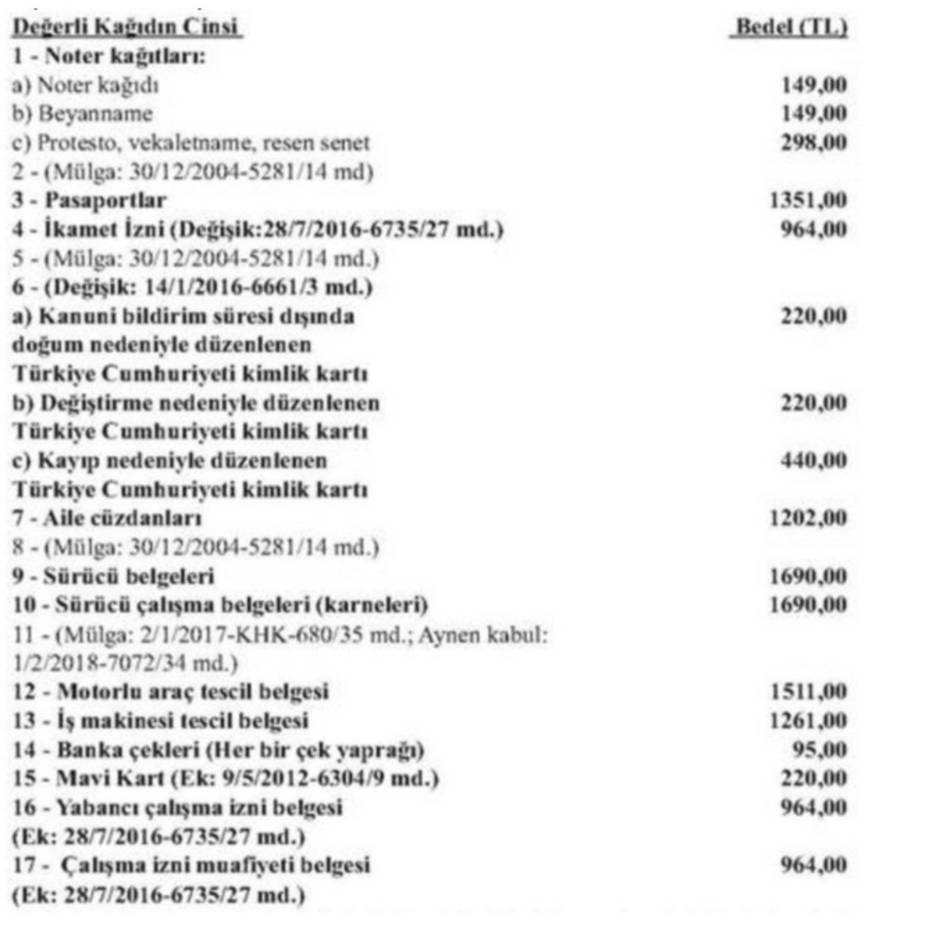 Aile cüzdanı bedeli 1202 lira olurken sürücü belgeleri ve sürücü çalışma belgeleri (karneleri) 1690 lira, motorlu araç tescil belgesi 1511 lira, iş makinesi tescil belgesi 1261 lira, banka çekleri (her bir çek yaprağı) 95 lira, mavi kart 220 lira, yabancı çalışma izni belgesi ve çalışma izni muafiyeti belgesi bedeli 964 lira olarak belirlendi.
