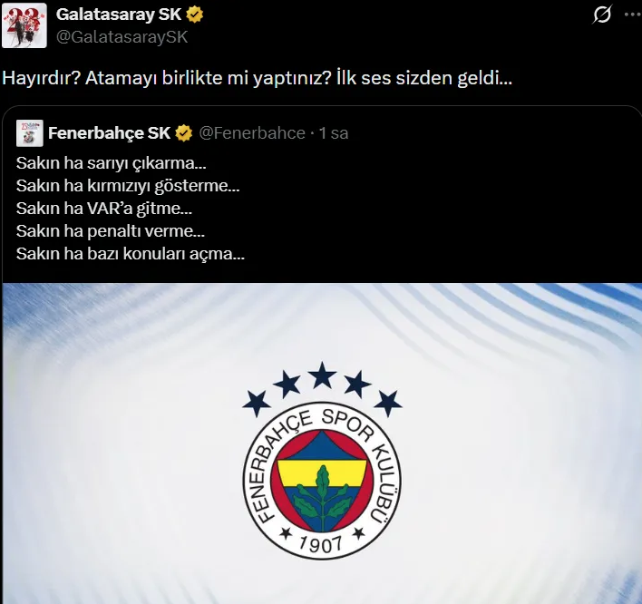 Sarı-lacivertlilerin bu paylaşımına, Galatasaray'dan yanıt geldi. Fenerbahçe'nin paylaşımını alıntılayan sarı-kırmızılılar paylaşımında şu ibareleri kullandı: