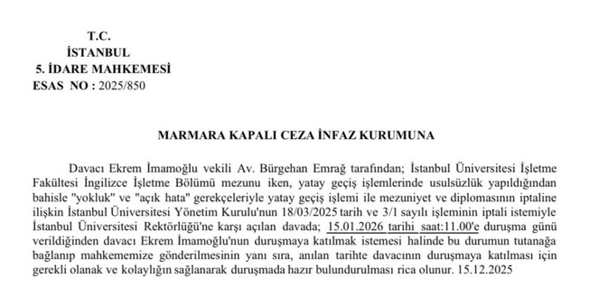 İstanbul İdare Mahkemesi, İmamoğlu’nun katılacağı duruşma için İdare Mahkemesi İdari İşler Müdürlüğü’ne ‘uygun’ salon hazırlanması için müzekkere yazdı.