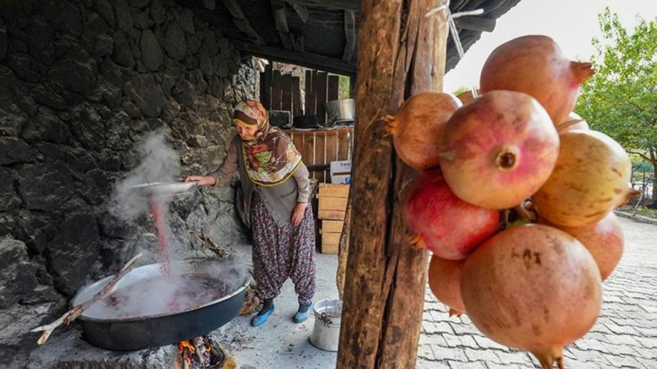 Ardından çuvallara doldurulan nar taneleri ezilerek suyu çıkarılıyor. Kadınlar, elde ettikleri nar suyunu, kurulan kazanlarda odun ateşinde saatlerce kaynatarak nar ekşisine dönüştürüyor.