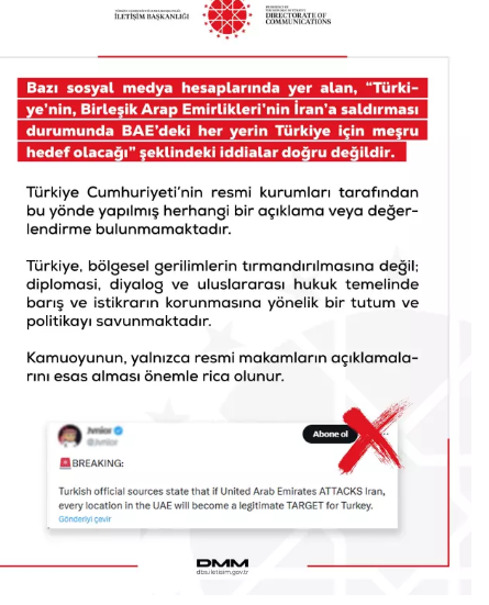 X platformunda bir kullanıcı tarafından paylaşılan ve “Birleşik Arap Emirlikleri’nin İran’a saldırması durumunda BAE’deki her yerin Türkiye için meşru hedef olacağı” iddiası, kısa sürede tartışma yarattı. Bazı medya kuruluşlarının da gündeme taşıdığı bu haberler üzerine Cumhurbaşkanlığı İletişim Başkanlığı Dezenformasyonla Mücadele Merkezi, iddiaları resmi olarak yalanladı. Kurum, söz konusu iddiaların gerçek dışı olduğunu vurgulayarak, halkı doğrulanmamış bilgilere itibar etmemeye çağırdı.