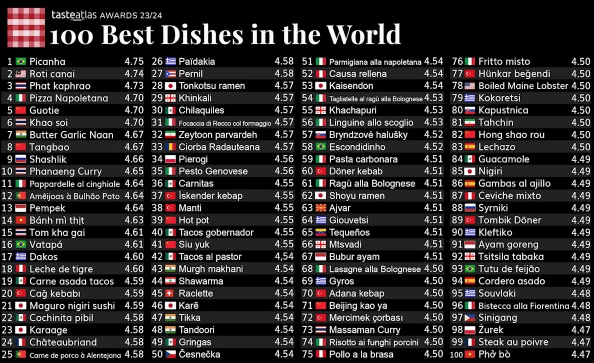 Türkiye, geleneksel yemekleri ve yerel ürünlerinin aldığı yüksek puanlarla bu yıl da listenin üst sıralarında kalmayı başardı. 4.49 puanla dünyanın en iyi 7. mutfağı olarak gösterilen Türkiye, geçen yıllardaki istikrarlı başarısını sürdürdü.