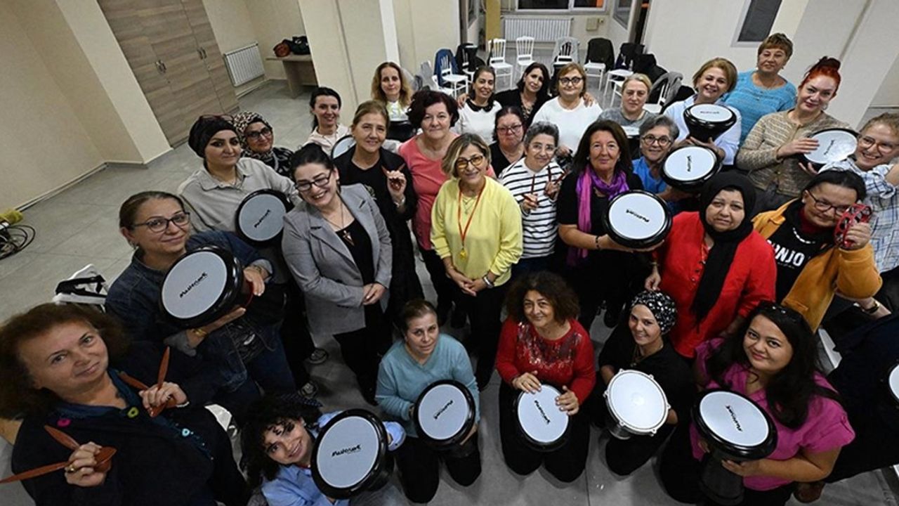 Ellerindeki darbuka ve zilli tef gibi enstrümanlar ve kaşıklarla haftanın iki günü belediye tarafından kendilerine gösterilen alanda çalışmalarını yapan kadınlar, çalan müziğe ritim tutup hem çalıyor hem de söylüyor.