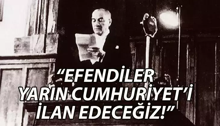 28 Ekim 1923 günü Çankaya Köşkü'ndeki akşam yemeğinde Atatürk "Efendiler, yarın Cumhuriyeti ilan edeceğiz!" sözünü söyledi. 29 Ekim 1923'te Cumhuriyet'in ilanıyla Türk milletinin tarihinde yeni bir döneme girilmiş oldu ve "Egemenlik kayıtsız, şartsız milletindir" sözü, devlet yönetimindeki yerini aldı.
