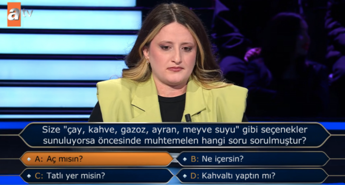 Kaynarca'nın yönelttiği, "Size 'çay, kahve, gazoz, ayran, meyve suyu' gibi seçenekler sunuluyorsa öncesinde muhtemelen hangi soru sorulmuştur?" sorusu, yarışmanın açılış sorusu olarak ekrana geldi. Şıklar arasında "Aç mısın?", "Ne içersin?", "Tatlı yer misin?" ve "Kahvaltı yaptın mı?" seçenekleri bulunuyordu.