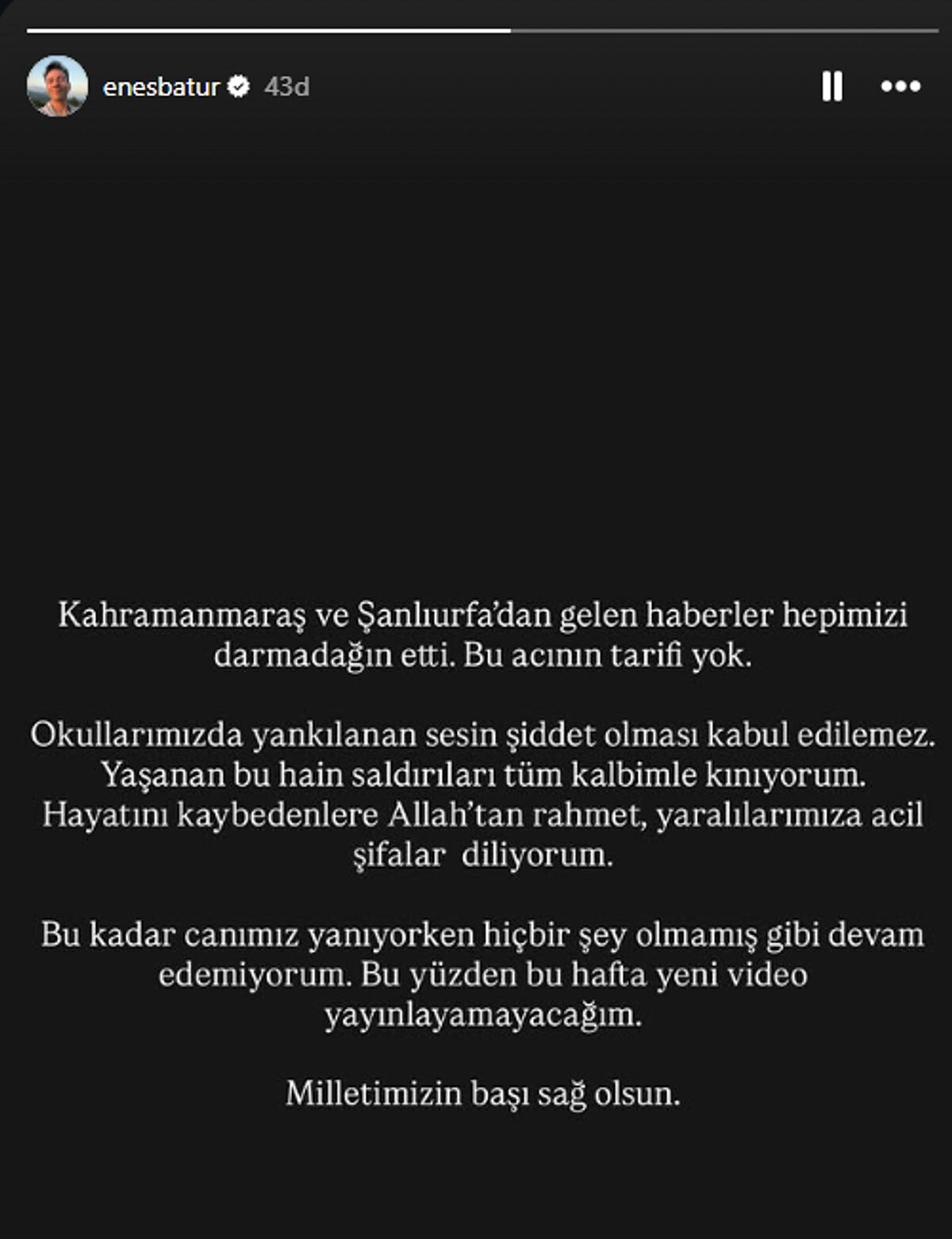 Batur paylaşımında şu ifadeleri kullandı: “Kahramanmaraş ve Şanlıurfa’dan gelen haberler hepimizi darmadağın etti. Bu acının tarifi yok. Bu kadar canımız yanıyorken hiçbir şey olmamış gibi devam edemiyorum. Bu yüzden bu hafta yeni video yayınlayamayacağım.”