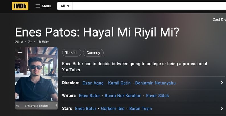 Batur, bu kez başrolünü üstlendiği ilk filmi “Hayal mi Gerçek mi?”nin adını değiştirdi ve filmin IMDB'de yer alan ismini “Enes Patos: Hayal mi Riyıl mı?” olarak değiştirdi.