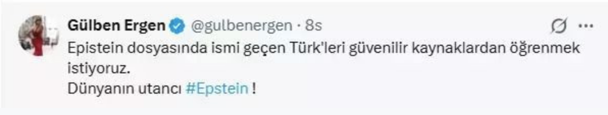 Ergen, sosyal medya hesabından yaptığı paylaşımda, “Epstein dosyasında ismi geçen Türkleri güvenilir kaynaklardan öğrenmek istiyoruz. Dünyanın utancı #Epstein” ifadelerini kullanarak, dosyada yer aldığı öne sürülen isimlere ilişkin şeffaflık çağrısında bulundu. Bu sözler kısa sürede kamuoyunda merak ve tartışmayı yeniden alevlendirdi.