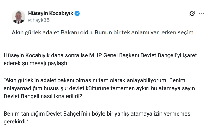 Resmî Gazete’de yayımlanan kararla İstanbul Cumhuriyet Başsavcısı Akın Gürlek, Adalet Bakanı olarak atandı. Eski AK Parti Milletvekili Hüseyin Kocabıyık ise atamayı değerlendirerek, “Bunun tek bir anlamı var” diyerek erken seçim sinyalini verdi.