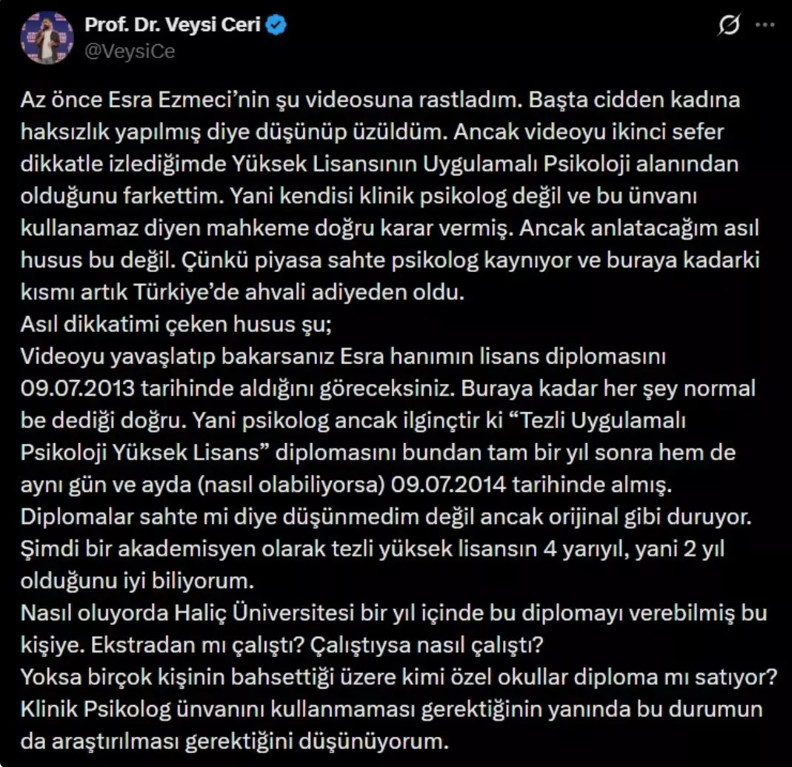 Prof. Dr. Veysi Ceri, Ezmeci'nin paylaşımını yayınlayarak ''Az önce Esra Ezmeci’nin şu videosuna rastladım. Başta cidden kadına haksızlık yapılmış diye düşünüp üzüldüm. Ancak videoyu ikinci sefer dikkatle izlediğimde Yüksek Lisansının Uygulamalı Psikoloji alanından olduğunu farkettim. Yani kendisi klinik psikolog değil ve bu ünvanı kullanamaz diyen mahkeme doğru karar vermiş. Ancak anlatacağım asıl husus bu değil. Çünkü piyasa sahte psikolog kaynıyor ve buraya kadarki kısmı artık Türkiye’de ahvali adiyeden oldu.