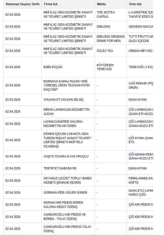 Güncellenen listede bu kez daha geniş bir ürün yelpazesi yer aldı. Denetimler sonucunda takviye edici gıdalar, bitkisel ürünler, içecekler, yağlar ve şarküteri ürünlerinde de uygunsuzluklar belirlendi. Kurallara aykırı üretim yaptığı saptanan yeni marka ve ürünler de listeye eklendi.