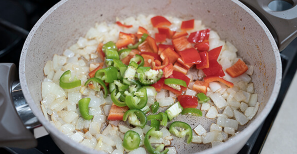 Kabak kalye için tencereye önce yağı, ardından soğanları ilave edin. Biraz kavurduktan sonra biberleri ekleyin.