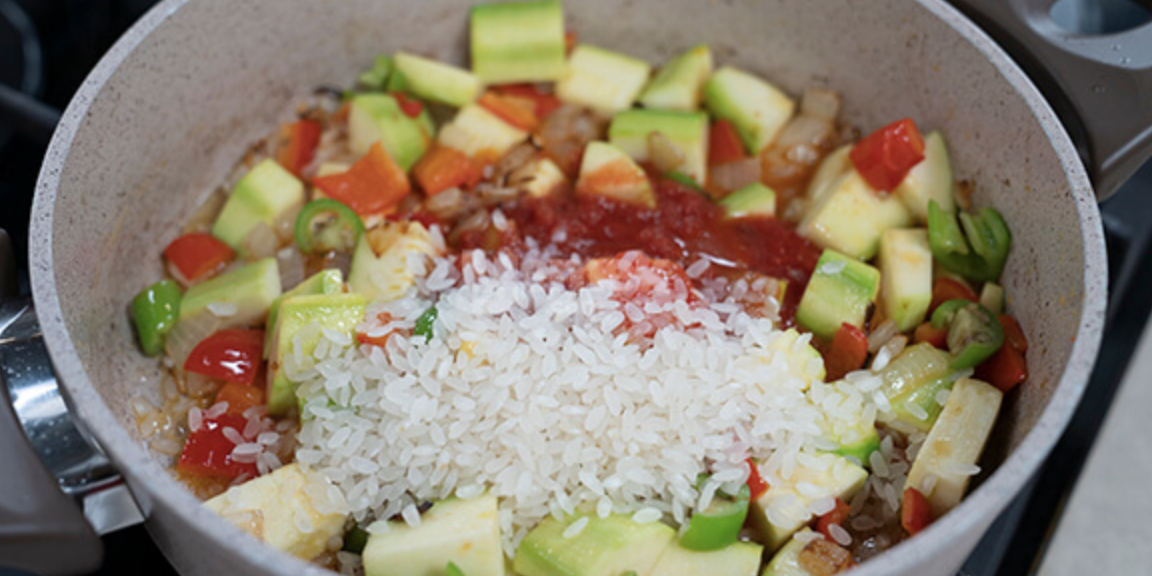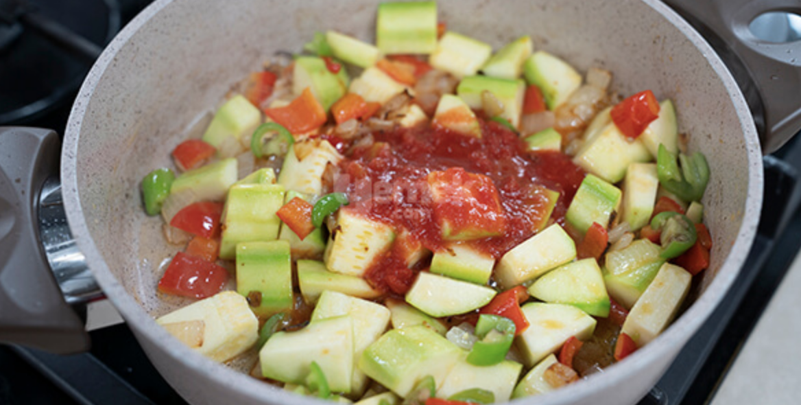 Üzerine kabakları ekleyin ve kavurmaya devam edin. Domates sosunu da ekleyin. Dilerseniz bu aşamada salça da kullanabilirsiniz ya da sade devam edebilirsiniz.