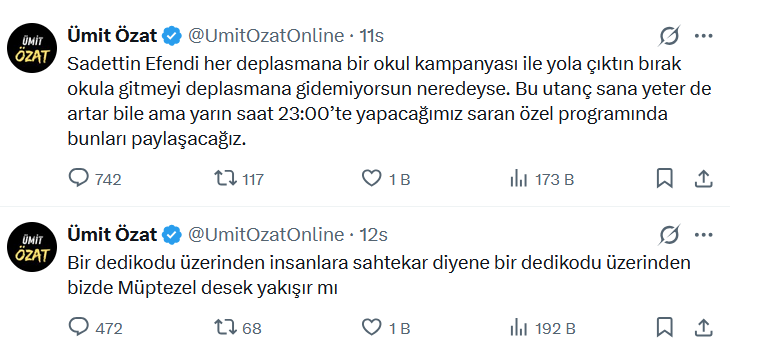 Ümit Özat ise 11 Mart akşamı X hesabından iki ayrı paylaşım yaptı. Oldukça öfkeli olduğu tahmin edilen Özat önce, "Bir dedikodu üzerinden insanlara sahtekar diyene bir dedikodu üzerinden biz de 'Müptezel' desek yakışır mı?" diye yazdı.